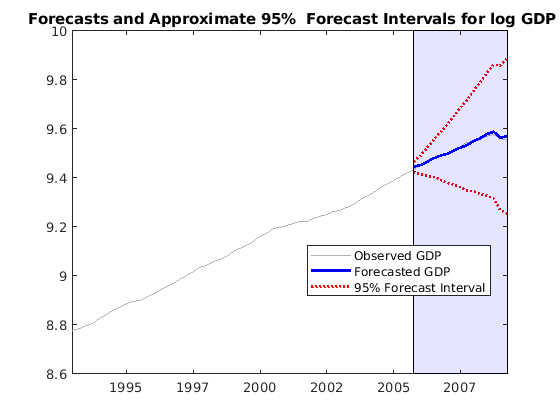 figure h1 = plot(dates(end-65:end),log(DataTable.GDP(end-65:end)),... 'Color',[.7,.7,.7]); datetick hold on h2 = plot(dates(frstHzn),gdpF,'b','LineWidth',2); h3 = plot(dates(frstHzn),gdpF+1.96*sqrt(gdpMSE),'r:',... 'LineWidth',2); plot(dates(frstHzn),gdpF-1.96*sqrt(gdpMSE),'r:',... 'LineWidth',2); ha = gca; title(['{\bf Forecasts and Approximate 95% }'... '{\bf Forecast Intervals for log GDP}']); ph = patch([repmat(dates(frstHzn(1)),1,2) repmat(dates(frstHzn(end)),1,2)],... [ha.YLim fliplr(ha.YLim)],... [0 0 0 0],'b'); ph.FaceAlpha = 0.1; legend([h1 h2 h3],{'Observed GDP','Forecasted GDP',... '95% Forecast Interval'},'Location','Best','AutoUpdate','off'); axis tight hold off