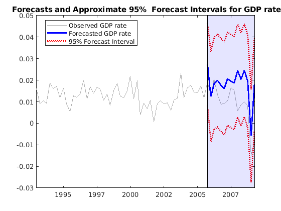 figure h1 = plot(dts(end-65:end),dlogGDP(end-65:end),... 'Color',[.7,.7,.7]); datetick hold on h2 = plot(dts(frstHzn),gdpF,'b','LineWidth',2); h3 = plot(dts(frstHzn),gdpF+1.96*sqrt(gdpMSE),'r:',... 'LineWidth',2); plot(dts(frstHzn),gdpF-1.96*sqrt(gdpMSE),'r:','LineWidth',2); ha = gca; title(['{\bf Forecasts and Approximate 95% }'... '{\bf Forecast Intervals for GDP rate}']); ph = patch([repmat(dts(frstHzn(1)),1,2) repmat(dts(frstHzn(end)),1,2)],... [ha.YLim fliplr(ha.YLim)],... [0 0 0 0],'b'); ph.FaceAlpha = 0.1; legend([h1 h2 h3],{'Observed GDP rate','Forecasted GDP rate ',... '95% Forecast Interval'},'Location','Best','AutoUpdate','off'); axis tight hold off