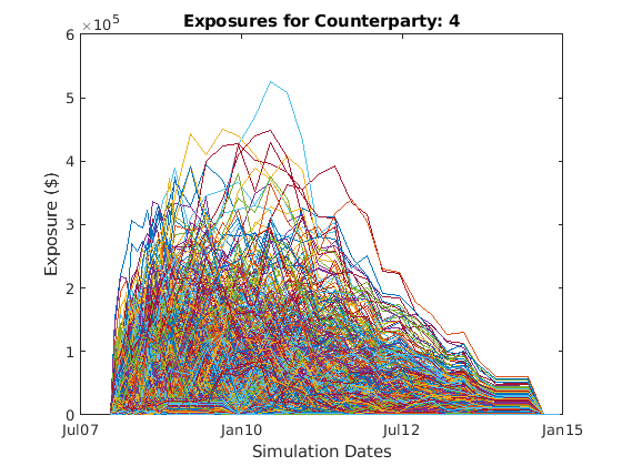 exposures = creditexposures(cpValues,swaps.Counterparty(cpIdx),... 'NettingID',swaps.NettingID(cpIdx));