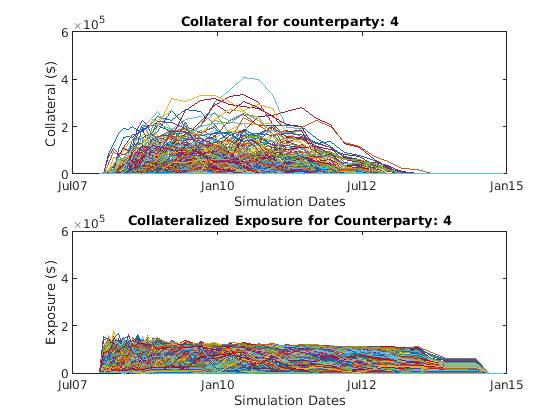 [collatExp, collatcpty, collateral] = creditexposures(cpValues,... swaps.Counterparty(cpIdx),'NettingID',swaps.NettingID(cpIdx),... 'CollateralTable',collateralTable,'Dates',simulationDates);
