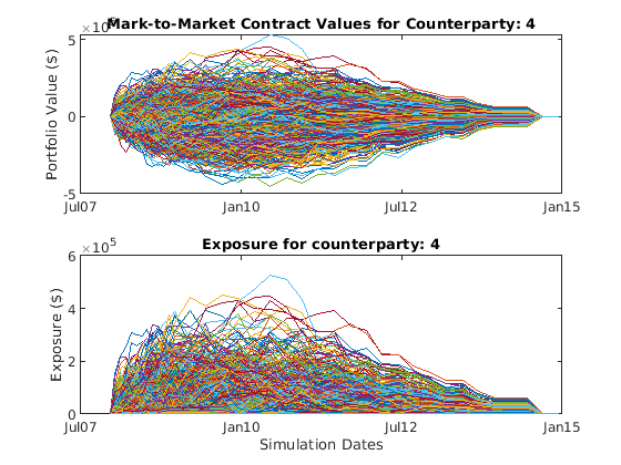 load ccr.mat % Look at one counterparty. cpID = 4; cpValues = squeeze(sum(values(:,swaps.Counterparty == cpID,:),2)); subplot(2,1,1) plot(simulationDates,cpValues); title(sprintf('Mark-to-Market Contract Values for Counterparty: %d',cpID)); datetick('x','mmmyy') ylabel('Portfolio Value ($)') % Compute the exposure by counterparty. [exposures, expcpty] = creditexposures(values,swaps.Counterparty,... 'NettingID',swaps.NettingID); % View the credit exposure over time for the counterparty. subplot(2,1,2) cpIdx = find(expcpty == cpID); plot(simulationDates,squeeze(exposures(:,cpIdx,:))); title(sprintf('Exposure for counterparty: %d',cpIdx)); datetick('x','mmmyy') ylabel('Exposure ($)') xlabel('Simulation Dates')