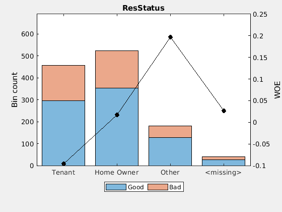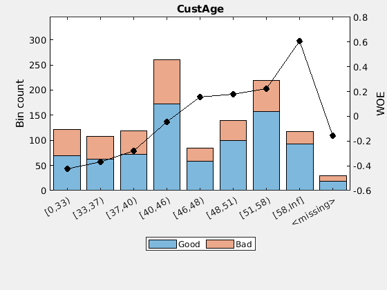Использование creditscorecard с аргументом имя-значение 'BinMissingData' установлено на true для ввода отсутствующих числовых или категорийных данных в отдельное интервал. Применить автоматическое раскладывание.
