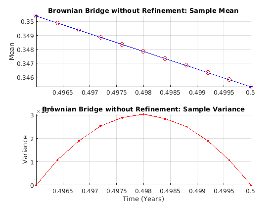 subplot(2,1,1); hold on; grid on; plot([T(n) T(n + 1)],[X(n,1) X(n + 1,1)],'.-b') plot(times, average, 'or') hold off; title('Brownian Bridge without Refinement: Sample Mean') ylabel('Mean') limits = axis; axis([T(n) T(n + 1) limits(3:4)]); subplot(2,1,2) hold on; grid on; plot(T(n),0,'.-b',T(n + 1),0,'.-b') plot(times, variance, '.-r') hold('off'); title('Brownian Bridge without Refinement: Sample Variance') xlabel('Time (Years)') ylabel('Variance') limits = axis; axis([T(n) T(n + 1) limits(3:4)]);