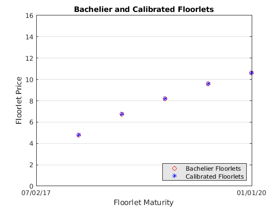 plot(MarketMatNum(2:end), Floorlets, 'or', MarketMatNum(2:end), OptimFloorlets, '*b'); datetick('x', 2) xlabel('Floorlet Maturity'); ylabel('Floorlet Price'); ylim ([0 16]); title('Bachelier and Calibrated Floorlets'); h = legend('Bachelier Floorlets', 'Calibrated Floorlets'); set(h, 'color', [0.9 0.9 0.9]); set(h, 'Location', 'SouthEast'); set(gcf, 'NumberTitle', 'off') grid on