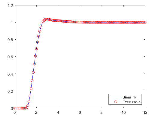 load fuzzyPID.mat plot(tout,y,'b-',rt_tout,rt_y,'ro') legend('Simulink','Executable','Location','Southeast')