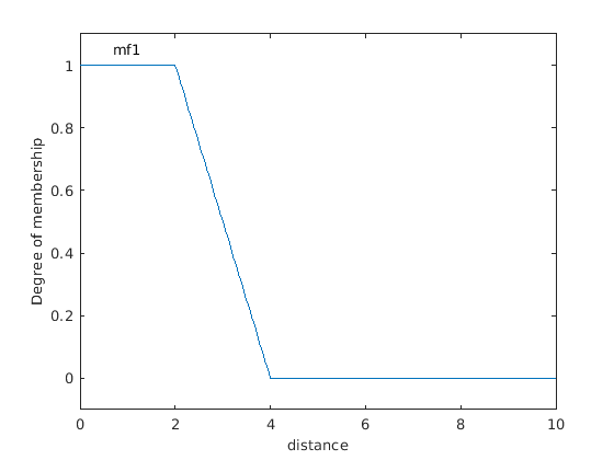 fis = addMF(fis,"distance"); fis.Inputs(3).MembershipFunctions(1).Type = "trapmf"; fis.Inputs(3).MembershipFunctions(1).Parameters = [-1 0 2 4]; plotmf(fis,"input",3)