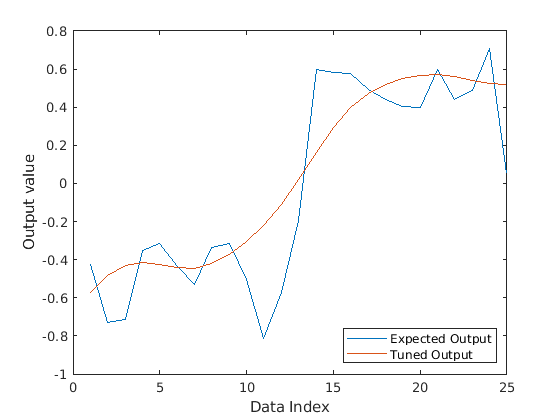 plot([outputData,outputTuned]) legend("Expected Output","Tuned Output","Location","southeast") xlabel("Data Index") ylabel("Output value")