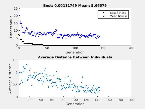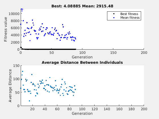 Верхний график, который отображает лучший фитнес для каждой генерации, показывает небольшой прогресс в снижении значения фитнеса. Нижний график показывает среднее расстояние между индивидуумами в каждой генерации, что является хорошей мерой разнообразия населения. Для этой настройки начальной области значений слишком мало разнесения, чтобы алгоритм мог прогрессировать.