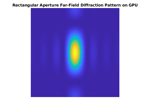 cfg = coder.gpuConfig('mex'); cfg.GpuConfig.EnableCUFFT = 1; codegen -config cfg -args {lightsource} fft2 farfieldsignalGPU = fft2_mex(lightsource); str = sprintf('Rectangular Aperture Far-Field Diffraction Pattern on GPU'); visualize(farfieldsignalGPU,str);