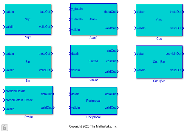 Тригонометрические Функциональные блоки, у которых значение Функции установлено на sin, cos, sincos, cos+jsin, или atan2 и для архитектуры HDL задано значение CORDIC