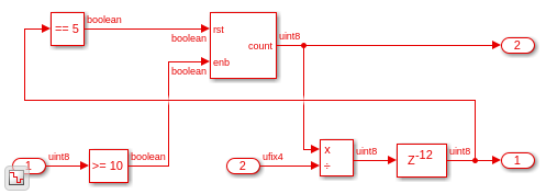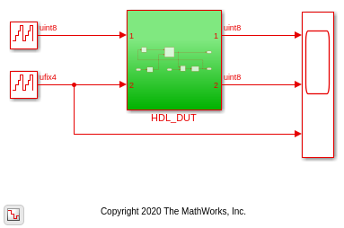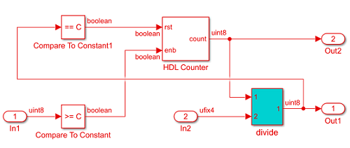 Внутри HDL_DUT подсистема, вы видите блок Delay, который имеет длину Delay, равную 12 рядом с блоком «Разделить». Эта длина задержки соответствует задержке операции деления для типов данных с фиксированной точкой. В этом случае необходимая Длина Задержки является суммой битовой ширины, 8, и 4, что равно 12.