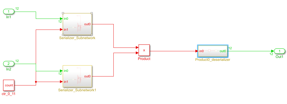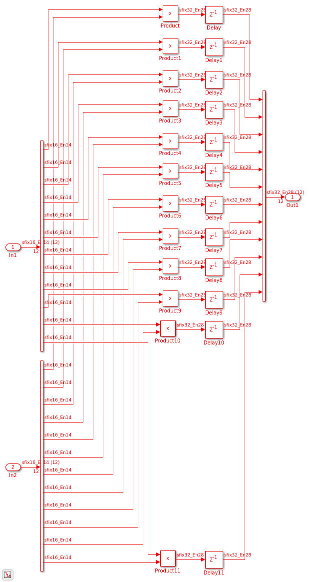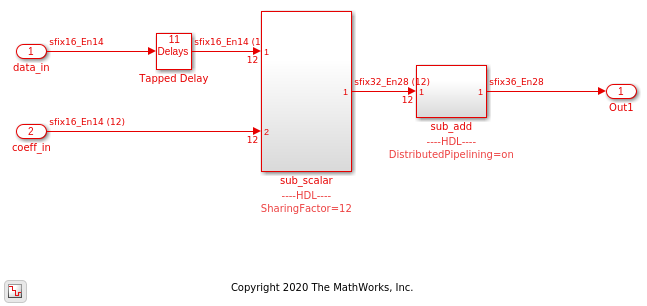 The sub_scalar подсистема состоит из 12 Блоки продукта, которые имеют модуль задержку рядом с ними. Для совместного использования этих блоков Продукта, SharingFactor of 12 задается на sub_scalar подсистема.