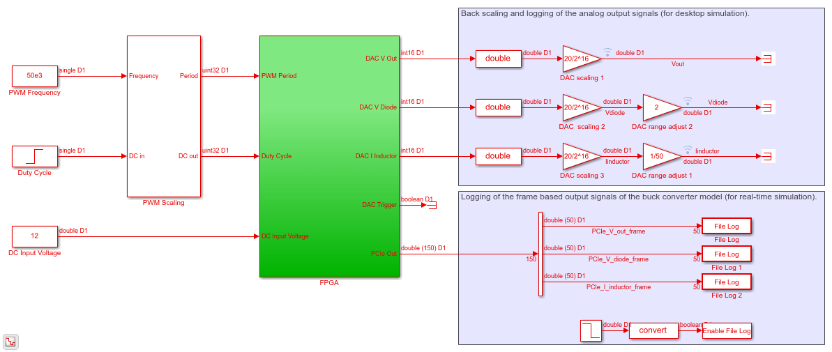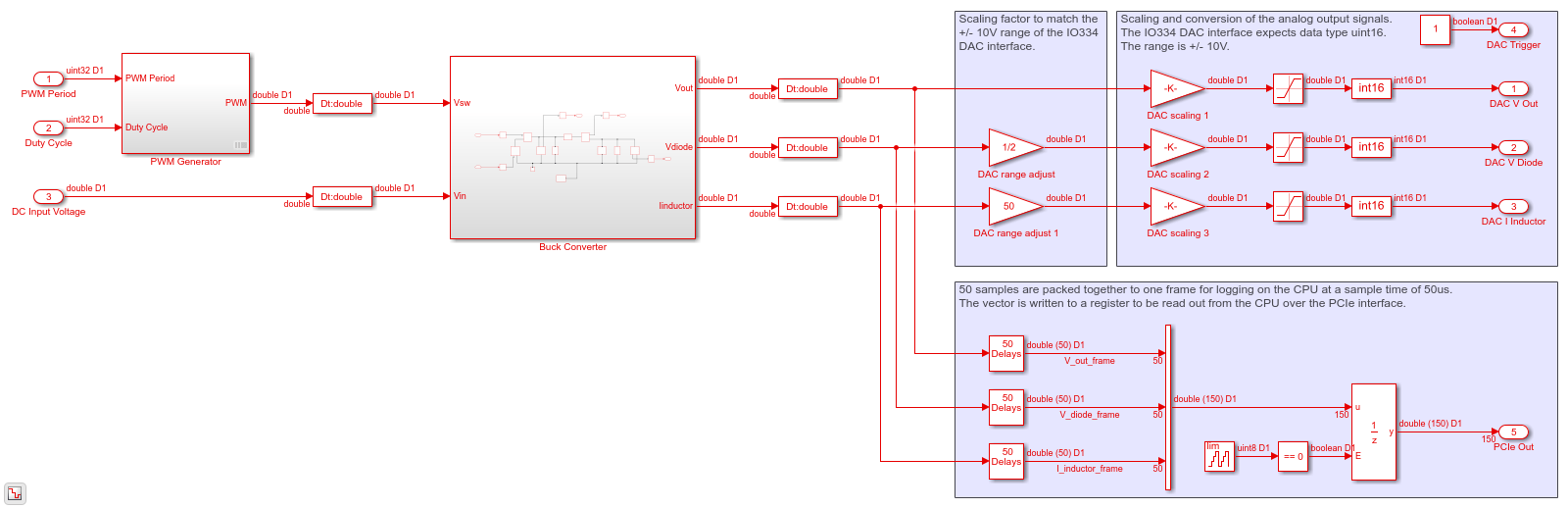 Вы генерируете код VHDL для блоков, которые находятся внутри зеленой подсистемы FPGA, которая содержит генератор PWM и понижающий конвертер. Код затем развертывается в FPGA на борту модуля IO334. Выходы подсистемы сопоставлены с интерфейсами DAC. Сигналы выхода от подсистемы Понижающего конвертера масштабируются в 10V область значений и преобразована в использование uint16 типы данных. 50 выборки упаковываются вместе в одну систему координат для регистрации выходных сигналов на центральном процессоре.