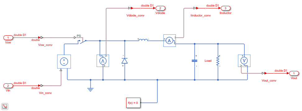 Модель содержит переключённую линейную замену Simulink исходной модели понижающего конвертера. Вы видите, что модель Simscape была заменена.
