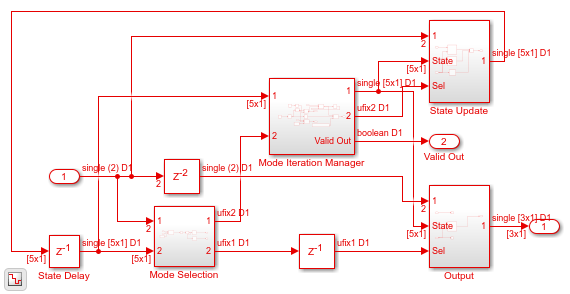Модель реализации заменяет подсистему Simscape на HDL-совместимый алгоритм, который выполняет расчеты пространства состояний. Когда вы перемещаетесь внутри этой подсистемы, вы видите несколько задержек, сумматоров и блоков Matrix Multiply, которые моделируют уравнения пространства состояний. Блоки From и Goto внутри этой подсистемы обеспечивают тот же вход, что и исходная модель, HDL Subsystem.