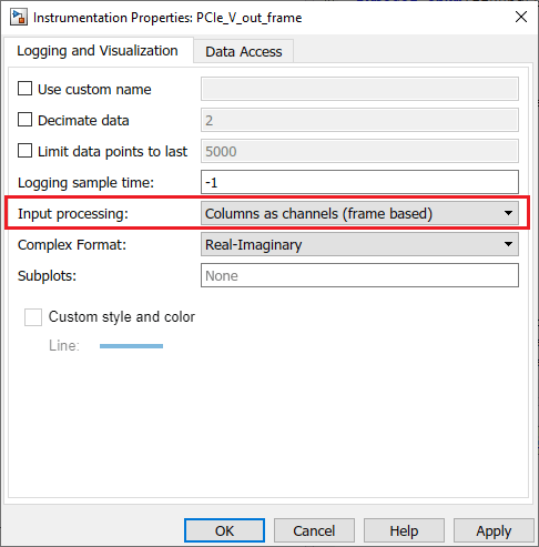 2. Установите настройку Данных моделирования Inspector Входа обработки равной Columns as channels (frame based) для сигналов PCIe_V_out_frame, PCIe_V_diode_frame и PCIe_I_inductor_frame. Внутри маски File Log блоки, щелкните правой кнопкой мыши символ регистрации и перейдите к диалоговому окну « Свойствам Инструментированию». Чтобы появиться сигнал регистрации, вам, возможно, придется обновить модель.