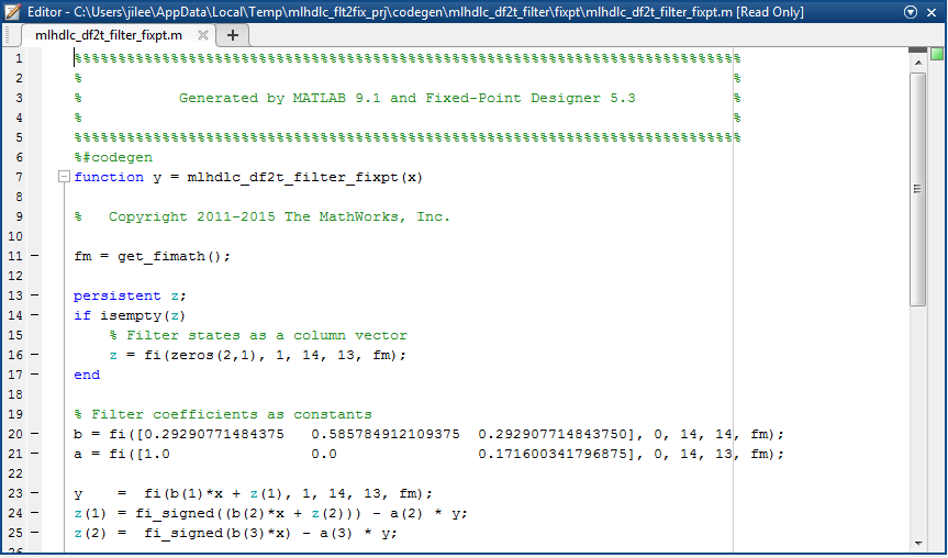 Сгенерированный код и другие программные продукты преобразования доступны через гиперссылки в выходе. Фиксированные точки явно показаны в сгенерированном коде MATLAB.