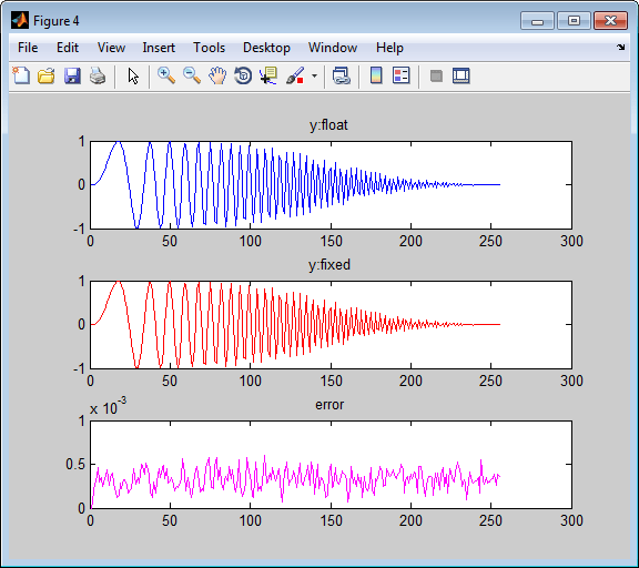 Если числовые результаты не соответствуют вашей желаемой точности после симуляции с фиксированной точкой, можно вернуться к шагу 'Propose Fixed-Point Types' в Рабочем процессе Advisor. Настройте настройки размера слова или индивидуально измените типы по мере необходимости и повторите оставшиеся шаги в рабочем процессе, пока вы не достигнете желаемых результатов.