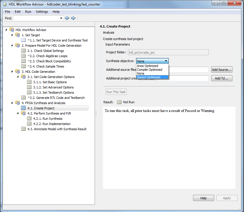 Используйте HDL Workflow Advisor, чтобы настроить проект с нужными настройками, такой как инструмент и Device. Начните, изменив рабочий процесс на «Generic ASIC/FPGA», чтобы мы могли аннотировать модель с результатами синтеза.