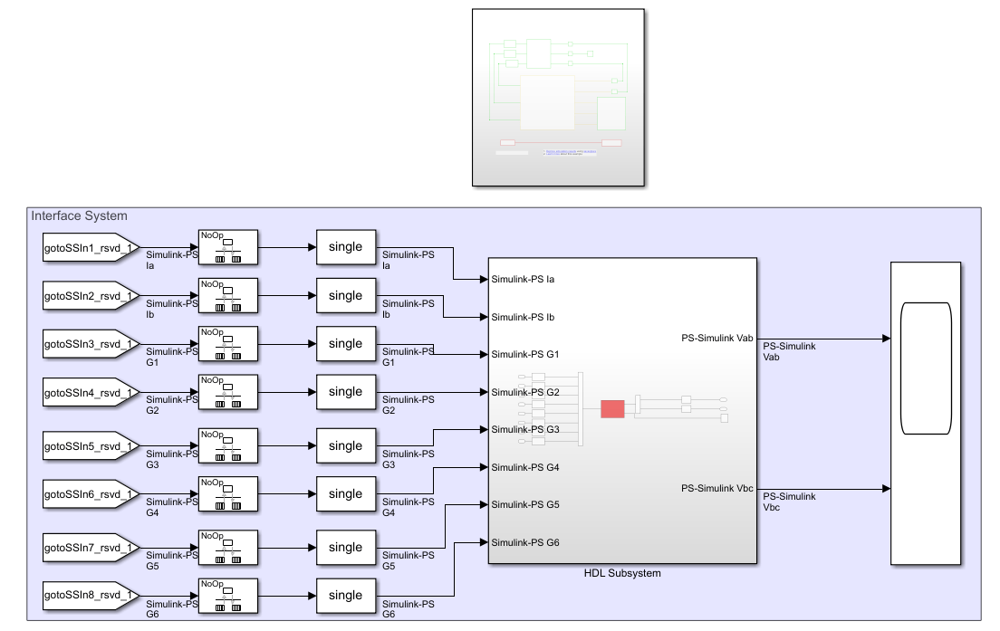 3. Блок Subsystem1 содержит блоки, которые вы запускаете в FPGA. Подсистема Simscape Inverter и Interface заменяется блоком HDL Subsystem. HDL- Блока Subsystem содержит алгоритм HDL, который содержит HDL- реализации алгоритма Simscape. Чтобы увидеть реализацию алгоритма HDL, откройте этот блок.
