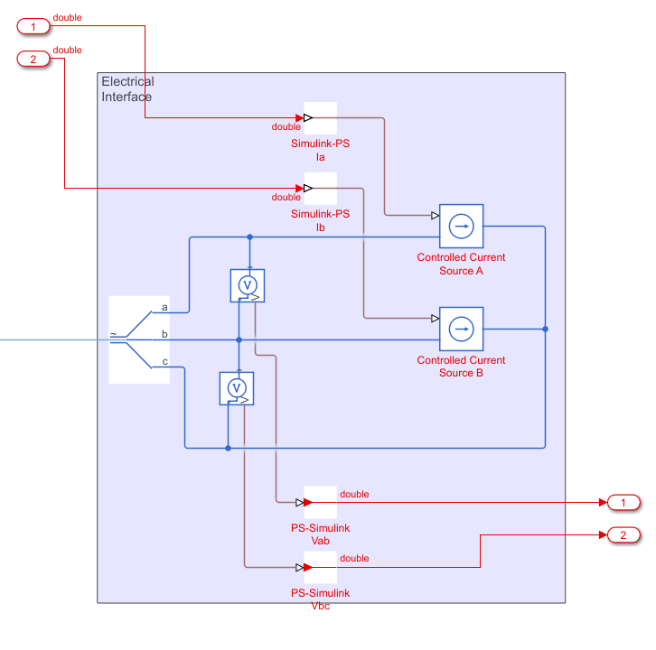 В модели ee_pmsm_drive_singleSL трехфазный инвертор и электрический интерфейс размещены внутри подсистемы Simscape Inverter и Interface.