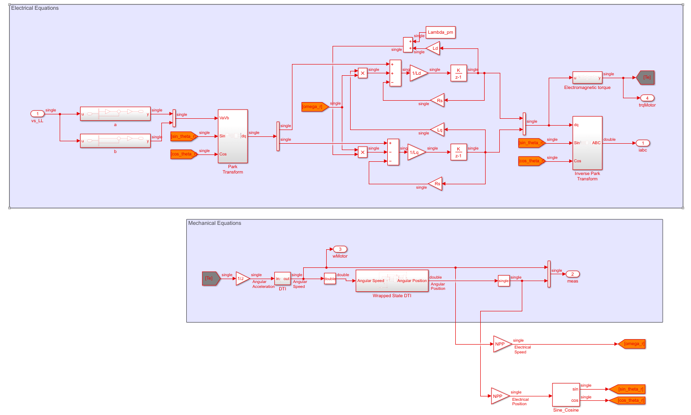 Интерфейс к PMSM изолирован от реализации. Чтобы реализовать PMSM с помощью блоков Simulink, вы используете Электрические Уравнения и Механические Уравнения. Внутри блоков Park Transform и Inverse Park Transform устраните блоки Sine и Cosine.