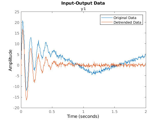 detrend вычитает смещения или линейные тренды из входных-выходных данных временной области, представленных в iddata объекты. detrend вычисляет данные тренда для вычитания или вычитает указанный тренд.