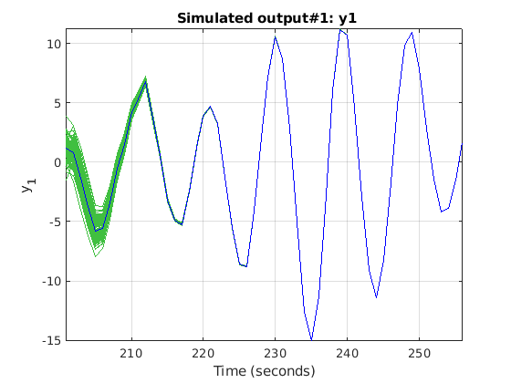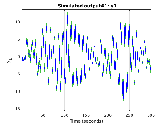 simsd( моделирует и строит графики отклика 10 возмущенных реализаций идентифицированной модели sys,udata)sys. Входные данные симуляции udata используется для вычисления симулированного отклика.