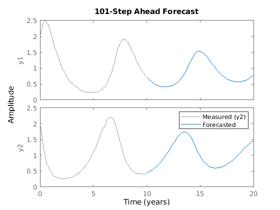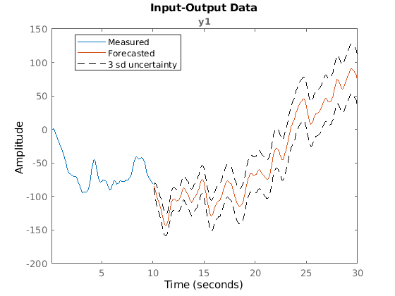 прогнозирует выход идентифицированной модели временных рядов yf = forecast(sys,PastData,K)sys, K шаги в будущее с использованием прошлых измеренных данных, PastData.