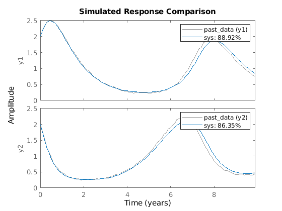 forecast выполняет предсказание в будущее, в области значений времени, превышающем последний момент измеренных данных. В противоположность этому, predict команда предсказывает реакцию идентифицированной модели на временной промежуток измеренных данных. Использовать predict чтобы определить, соответствует ли предсказанный результат наблюдаемой реакции предполагаемой модели. Если sys является хорошей моделью предсказания, рассмотрите использование ее с forecast.