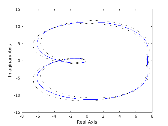 nyquist(sys1,sys2,...,sysN) или nyquist(sys1,sys2,...,sysN,w) накладывает годографы Найквиста нескольких моделей LTI на одну фигуру. Все системы должны иметь одинаковое количество входов и выходов, но могут быть комбинацией систем непрерывного и дискретного времени. Можно также задать отличительный цвет, LineStyle и/или маркер для каждого системного графика с синтаксисом nyquist(sys1,'PlotStyle1',...,sysN,'PlotStyleN').