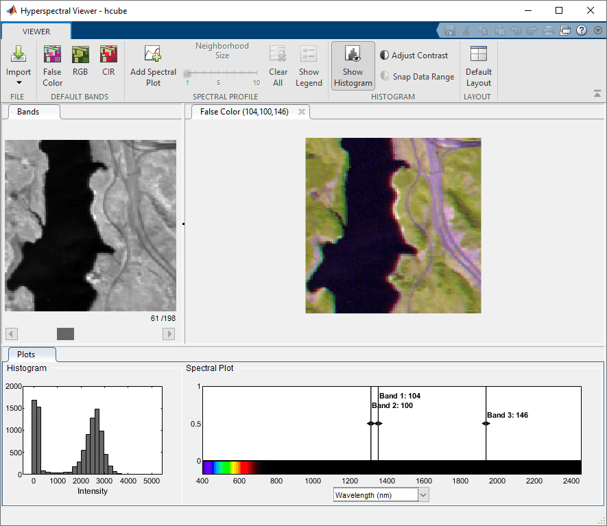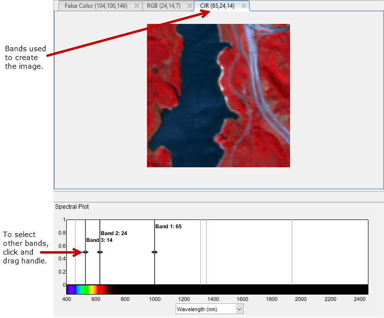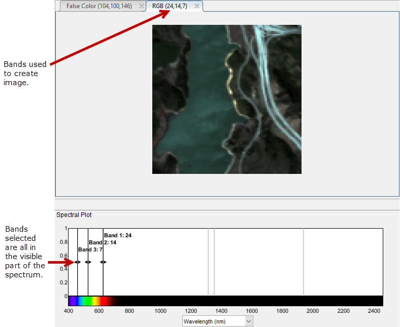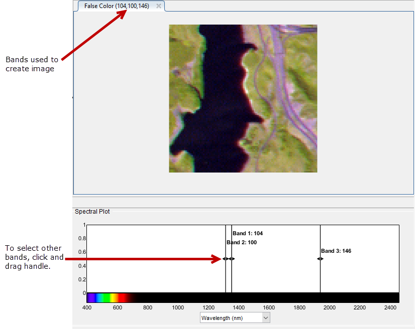 По умолчанию приложение отображает ложно-цветовое представление данных. Композиты ложного цвета визуализируют длины волн, которые не может видеть человеческий глаз. Вкладка панели определяет тип цветного изображения, False Color и диапазоны, которые приложение использовало для его формирования (104 100 146), в красно-зелено-синем порядке. Приложение указывает в спектральном графике, какие полосы были использованы. Чтобы изменить эти выбора полосы, щелкните и перетащите указатель указателя на полосу в спектральном графике. Если вы выбираете другую полосу, приложение обновляет текст на вкладке новыми полосами и добавляет слово «Custom», например, False Color-Custom.