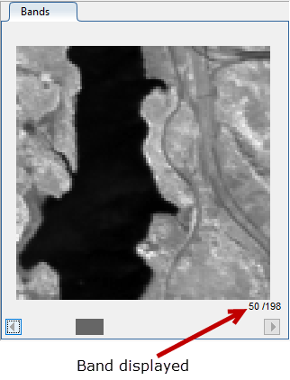 Исследуйте спектральные полосы набора данных хребта Джаспера как стек полутоновых изображений на панели Полосы. Для навигации по изображениям используйте ползунок в нижней части панели. Поскольку каждая полоса изолирует определенную область значений длин волн, аспекты сцены могут быть более ясными в некоторых полосах, чем другие.
