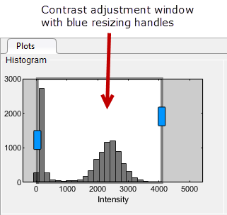 Чтобы улучшить контрастность полосы, нажмите Настроить контрастность на панели инструментов приложения. Когда вы это делаете, приложение накладывает окно корректировки контраста на гистограмму изображения, отображаемую на панели Plot. Чтобы настроить контрастность, переместите окно по гистограмме или измените размер окна, нажав и перетащив указатели. Приложение настраивает контрастность с помощью метода, называемого контрастным растяжением. В этом процессе значения пикселей ниже заданного значения отображаются черным цветом, значения пикселей выше заданного значения отображаются белым цветом, а значения пикселей между этими двумя значениями отображаются в виде оттенков серого цвета. Результатом является линейное отображение подмножества значений пикселей во всюсь область значений серых, от черного до белого, получая изображение с более высокой контрастностью. Чтобы вернуться к представлению по умолчанию, щелкните Привязка области значений данных. Чтобы удалить окно корректировки контраста из гистограммы, нажмите кнопку Настроить контрастность.