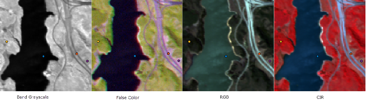 Например, следующий рисунок показывает четыре точки, выбранные в каждой визуализации, каждая точка, представляющая конкретный тип данных: вода, растительность, дорога и земля.