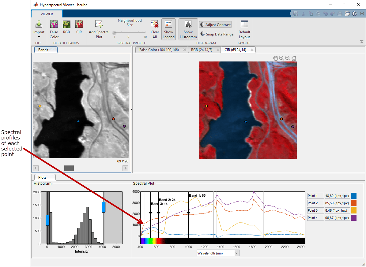 Приложение отображает несколько представлений гиперспектральных данных Jasper Ridge. На панели « Полосах» отображаются полосы данных гиперспектраля в виде стека полутоновых изображений. Вторая панель включает составные представления гиперспектральных данных, отображая вкладку Ложный цвет (False Color) по умолчанию. На панели Графики (Plots) отображается гистограмма области данных, отображаемой в данный момент на панели Полосы (Bands), и график спектральной размерности данных по длине волны или по полосе. (Можно переставить эти панели, нажав и перетащив их внутрь приложения. Чтобы вернуться к стандартному расположению панелей, щелкните Макет по умолчанию на панели инструментов приложения.)