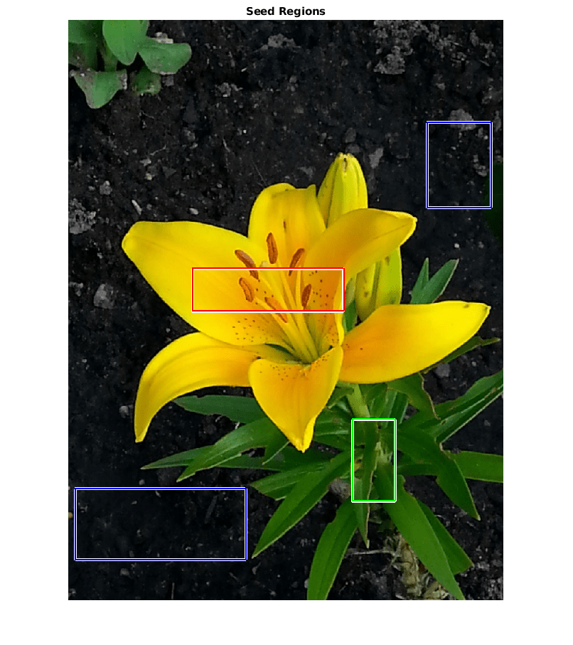 imshow(RGB) hold on visboundaries(BW1,'Color','r'); visboundaries(BW2,'Color','g'); visboundaries(BW3,'Color','b'); title('Seed Regions')