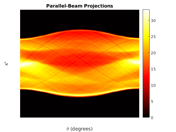 Датчики параллельного луча приняты с интервалом в один пиксель. Углы поворота параллельных лучей расположены на одинаковых расстояниях, чтобы покрыть [0,180] степени. Рассчитанные углы поворота вентилятора-луча имеют тот же интервал, что и углы поворота параллельного луча, и крышку [0,360) степеней. Вычисленные углы вентилятора-луча равномерно разнесены с шагом, установленным на наименьший угол, подразумеваемый интервалом между датчиками.