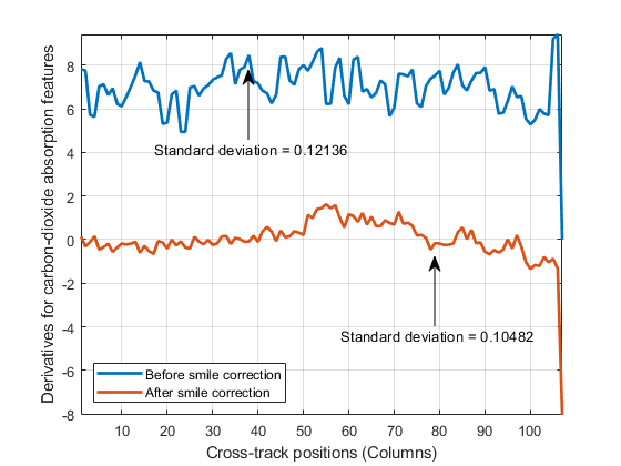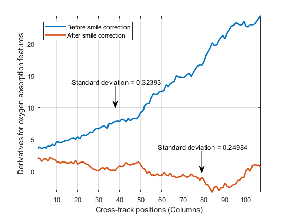 [ вычисляет средние производные по столбцу и их стандартные отклонения для функций поглощения кислорода и двуокиси углерода в наборе гиперспектральных данных. Можно использовать эти значения, чтобы обнаружить спектральный эффект улыбки в гиперспектральном наборе данных. Для получения дополнительной информации см. «Индикаторы улыбки».oxystd,carbonstd,oxyderiv,carbonderiv] = smileMetric(hcube)