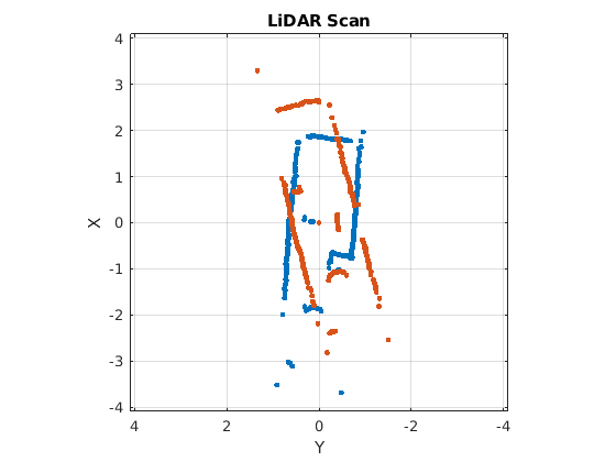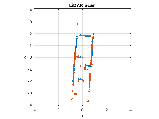оценивает относительное положение между двумя сканами на основе совпадающих функций линии, идентифицированных в каждом скане. Задайте начальное предположение относительно относительного положения, relpose = matchScansLine(currScan,refScan,initialRelPose)initialRelPose.