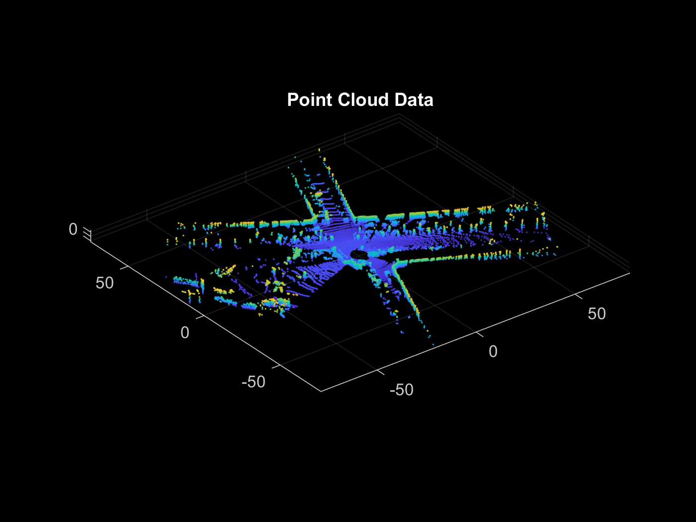 % Get the full file path to the PNG files in the scenario1 folder. pointCloudFilePattern = fullfile(dataFolder, 'scenario1', 'scan*.png'); % Create a file datastore to read files in the right order. fileDS = fileDatastore(pointCloudFilePattern, 'ReadFcn', ... @helperReadVelodyneSLAMData); % Read the point clouds. ptCloudArr = readall(fileDS); % Select a subset of point cloud scans, and split the data to use for % map building and for localization. ptCloudMap = vertcat(ptCloudArr{1:5:1550}); ptCloudLoc = vertcat(ptCloudArr{2:5:1550}); % Visualize the first point cloud. figure pcshow(ptCloudMap(1)) title('Point Cloud Data')