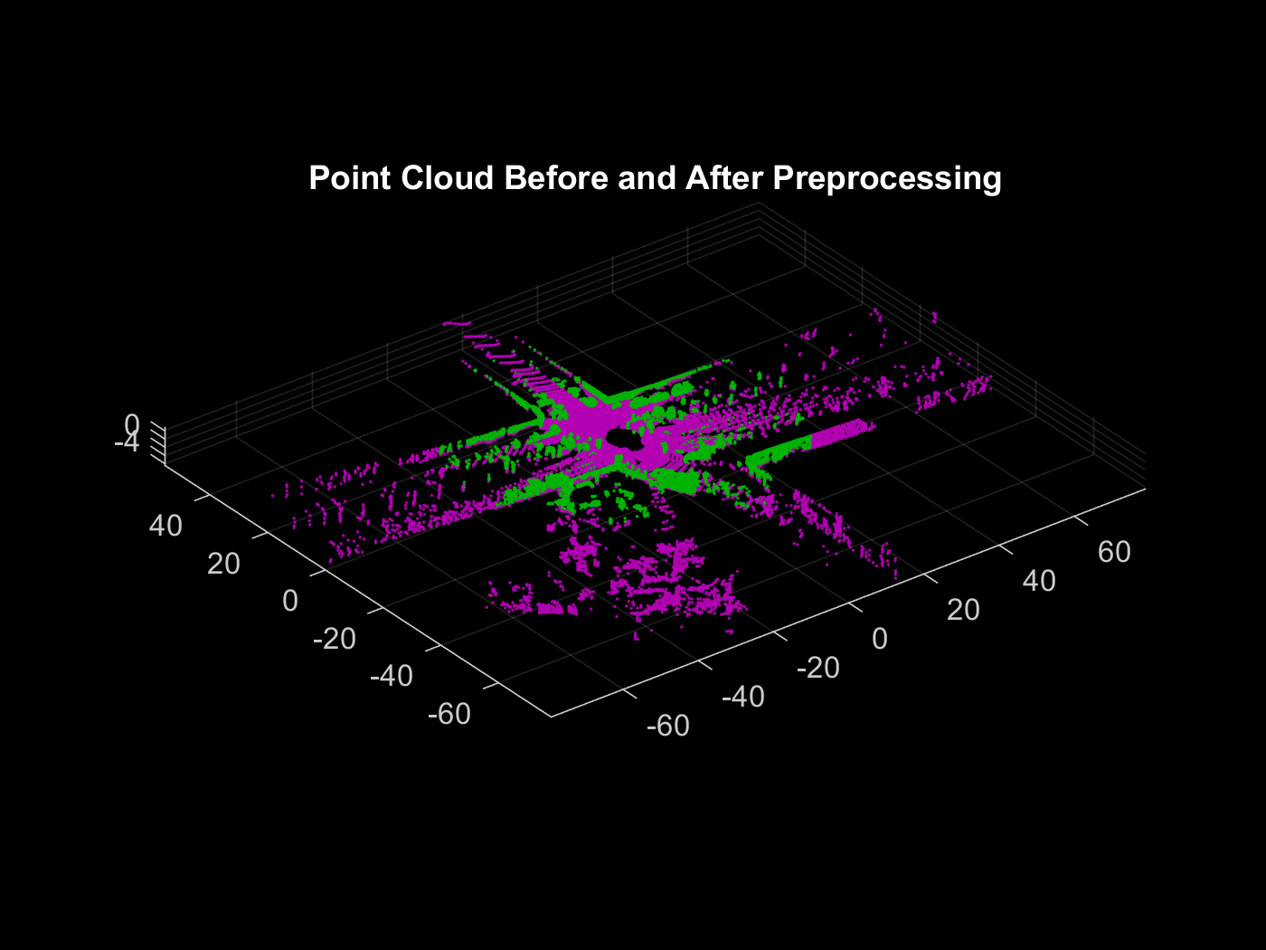 Предварительная обработка предыдущего и текущего облака точек с помощью helperPreProcessPointCloud. Понижайте частоту облаков точек с помощью pcdownsample улучшить скорость и точность регистрации. Чтобы настроить процентный вход downsample, найдите самое низкое значение, которое поддерживает необходимую точность регистрации, когда транспортное средство поворачивается.