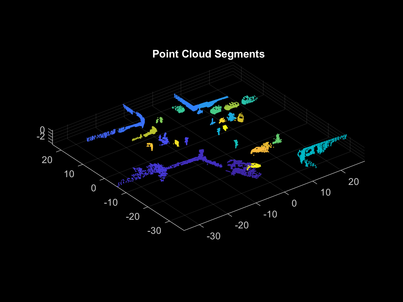 minNumPoints = 150; distThreshold = 1; angleThreshold = 180; [labels, numClusters] = segmentLidarData(ptCloudNoGround, distThreshold, ... angleThreshold, 'NumClusterPoints', minNumPoints); % Remove points that contain a label value of 0 for visualization. idxValidPoints = find(labels); labelColorIndex = labels(idxValidPoints); segmentedPtCloud = select(ptCloudNoGround, idxValidPoints); figure pcshow(segmentedPtCloud.Location, labelColorIndex) title('Point Cloud Segments')