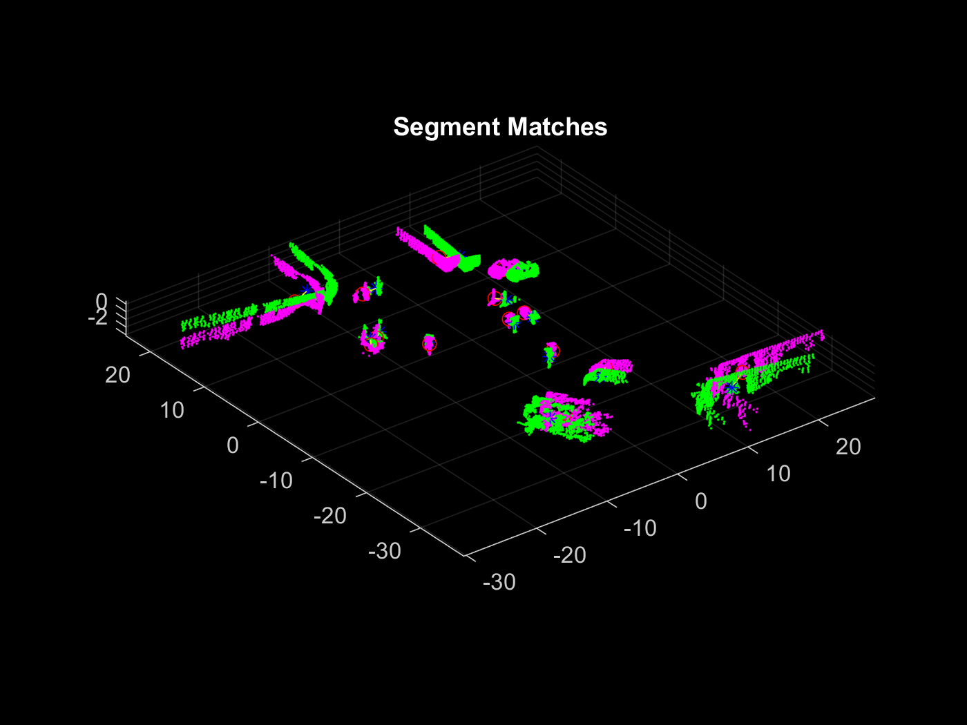 Алгоритм SegMatch состоит из четырех различных компонентов: сегментация облака точек, редукция данных, соответствие сегментов и геометрическая верификация. Для достижения наилучших результатов предварительно обработайте облако точек перед выполнением этих четырех шагов.