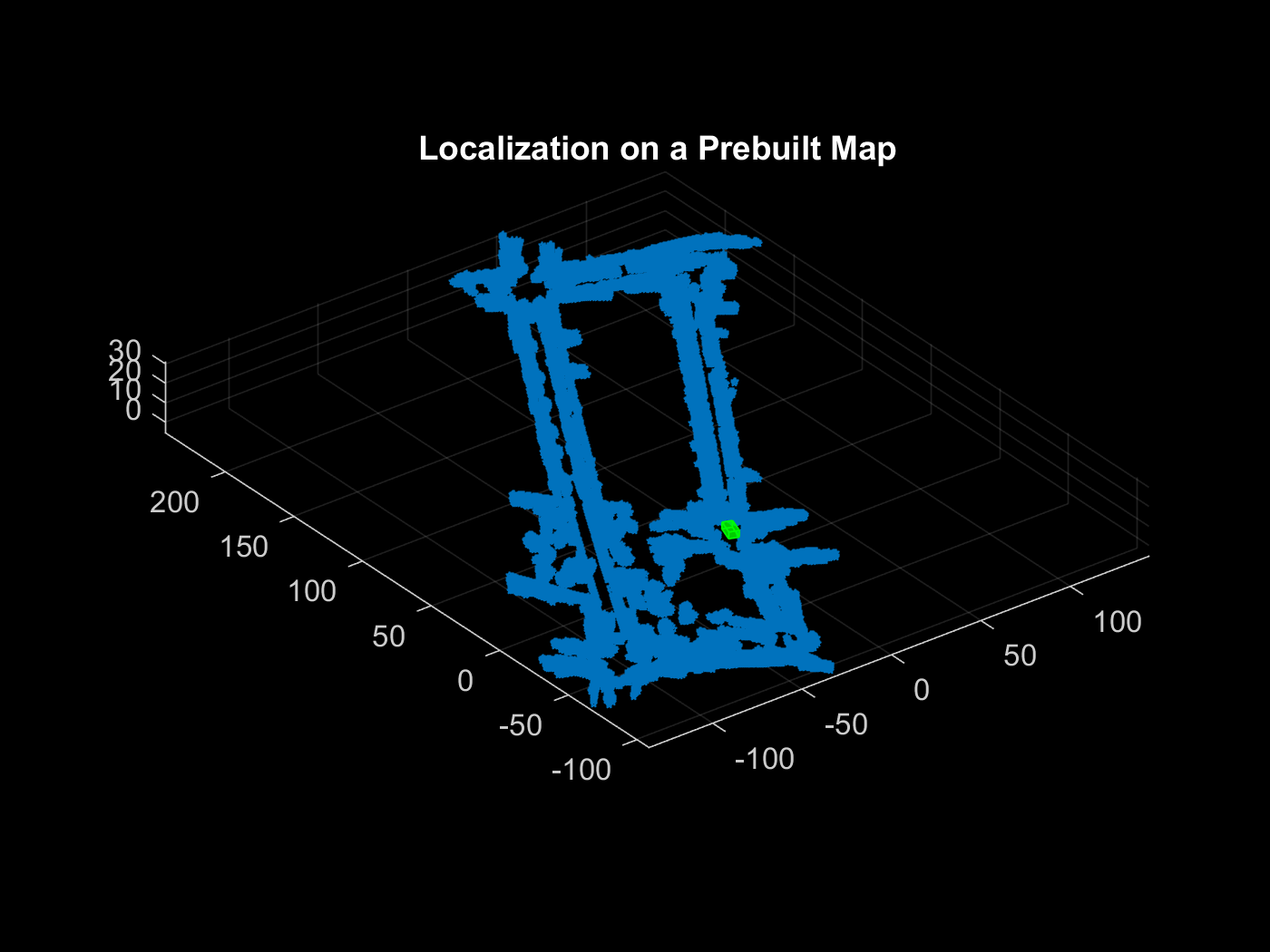 % Visualize the map. figure('Visible', 'on') hAx = pcshow(mapSegments.Location, 'p'); title('Localization on a Prebuilt Map') % Set parameter to update submap. submapThreshold = 30; % Initialize the poses and previous point cloud for registration. prevPtCloud = ptCloud; relPose = rigid3d; prevAbsPose = rigid3d; % Segment each point cloud and localize by finding segment matches. for n = 2:numel(ptCloudLoc) ptCloud = ptCloudLoc(n); % Preprocess the point cloud. ptCloud = helperPreProcessPointCloud(ptCloud, egoRadius, cylinderRadius); % Segment the point cloud and extract features. labels = segmentLidarData(ptCloud, distThreshold, angleThreshold, ... 'NumClusterPoints', minNumPoints); features = extractEigenFeatures(ptCloud, labels); % Localize the point cloud. absPoseMap = findPose(sMap, features, 'MatchThreshold', 1, 'MinNumInliers', 5); % Do registration when the position cannot be estimated with segment % matching. if isempty(absPoseMap) relPose = pcregisterndt(ptCloud, prevPtCloud, gridStep, ... 'InitialTransform', relPose); absPoseMap = rigid3d(relPose.T * prevAbsPose.T); end % Display position estimate in the map. poseTranslation = absPoseMap.Translation; eul = rotm2eul(absPoseMap.Rotation'); theta = rad2deg(eul); pos = [poseTranslation, 5, 9, 3.5, theta(2), theta(3), theta(1)]; showShape('cuboid', pos, 'Color', 'green', 'Parent', hAx, 'Opacity', 0.8, 'LineWidth', 0.5) % Determine if selected submap needs to be updated. [isInside, distToEdge] = isInsideSubmap(sMap, poseTranslation); needSelectSubmap = ~isInside ... % Current pose is outside submap. || any(distToEdge(1:2) < submapThreshold); % Current pose is close to submap edge. % Select a new submap. if needSelectSubmap sMap = selectSubmap(sMap, poseTranslation, submapSize); end prevAbsPose = absPoseMap; prevPtCloud = ptCloud; end