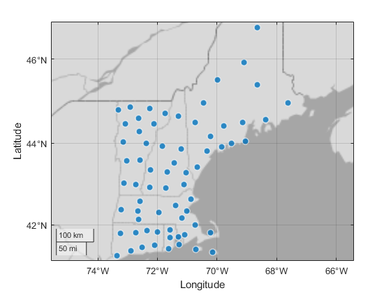 Можно также изменить основную карту по умолчанию для всех графиков, созданных с помощью geoplot, geoscatter, и geodensityplot во время вашего Сеанса работы с MATLAB.