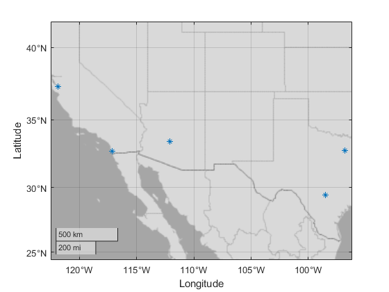 lat1 = [33.448 29.424 32.716 32.777 37.338]; lon1 = [-112.074 -98.494 -117.161 -96.797 -121.886]; geoscatter(lat1,lon1,'*') geobasemap darkwater