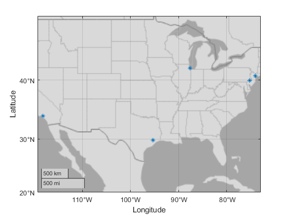 figure lat2 = [40.713 34.052 41.878 29.760 39.952]; lon2 = [-74.006 -118.244 -87.630 -95.370 -75.165]; geoaxes('Basemap','darkwater') hold on geoscatter(lat2,lon2,'*')