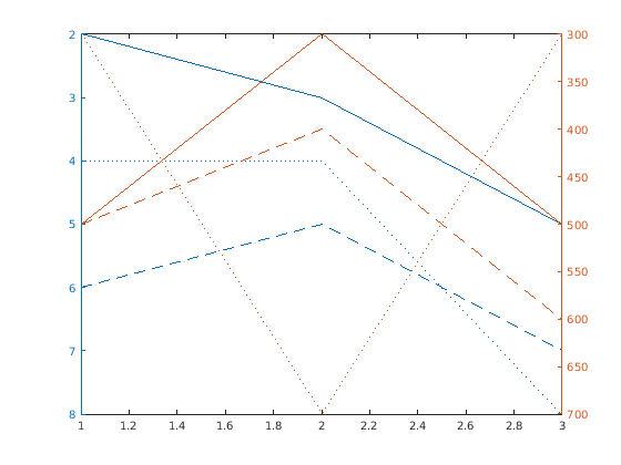 x = [1 2 3]; y1 = [2 6 4; 3 5 4; 5 7 8]; y2 = 100*[5 5 3; 3 4 7; 5 6 3]; figure yyaxis left plot(x,y1) yyaxis right plot(x,y2)