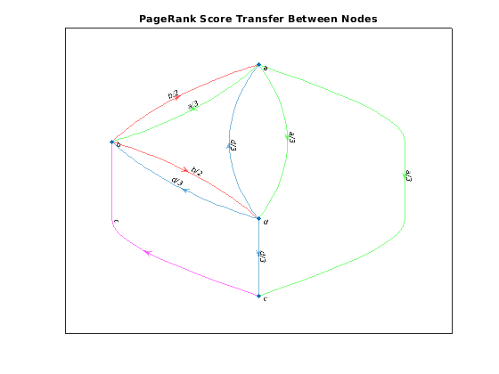 Другими словами, ранг каждой страницы в значительной степени основан на рангах страниц, которые ссылаются на нее. Термин A'*(r./d) выбирает счета исходных узлов, которые соединяются с каждым узлом в графике, и счета нормируются общим количеством исходящих ссылок этих исходных узлов. Это гарантирует, что сумма счетов PageRank всегда 1. Например, если узел 2 соединяет узлы 1, 3 и 4, то он передает 1/3 PageRank счета с каждым из этих узлов во время каждой итерации алгоритма.
